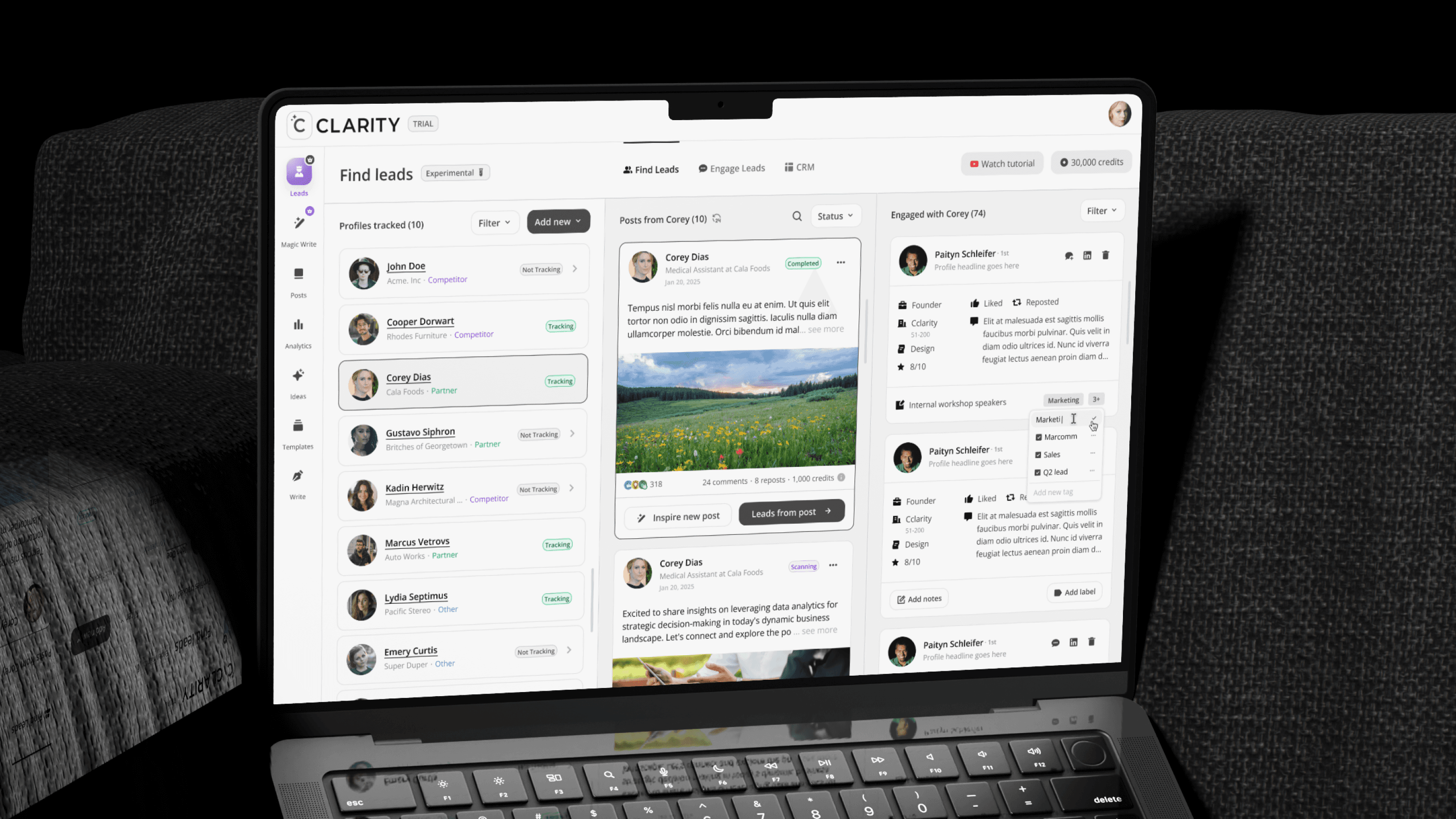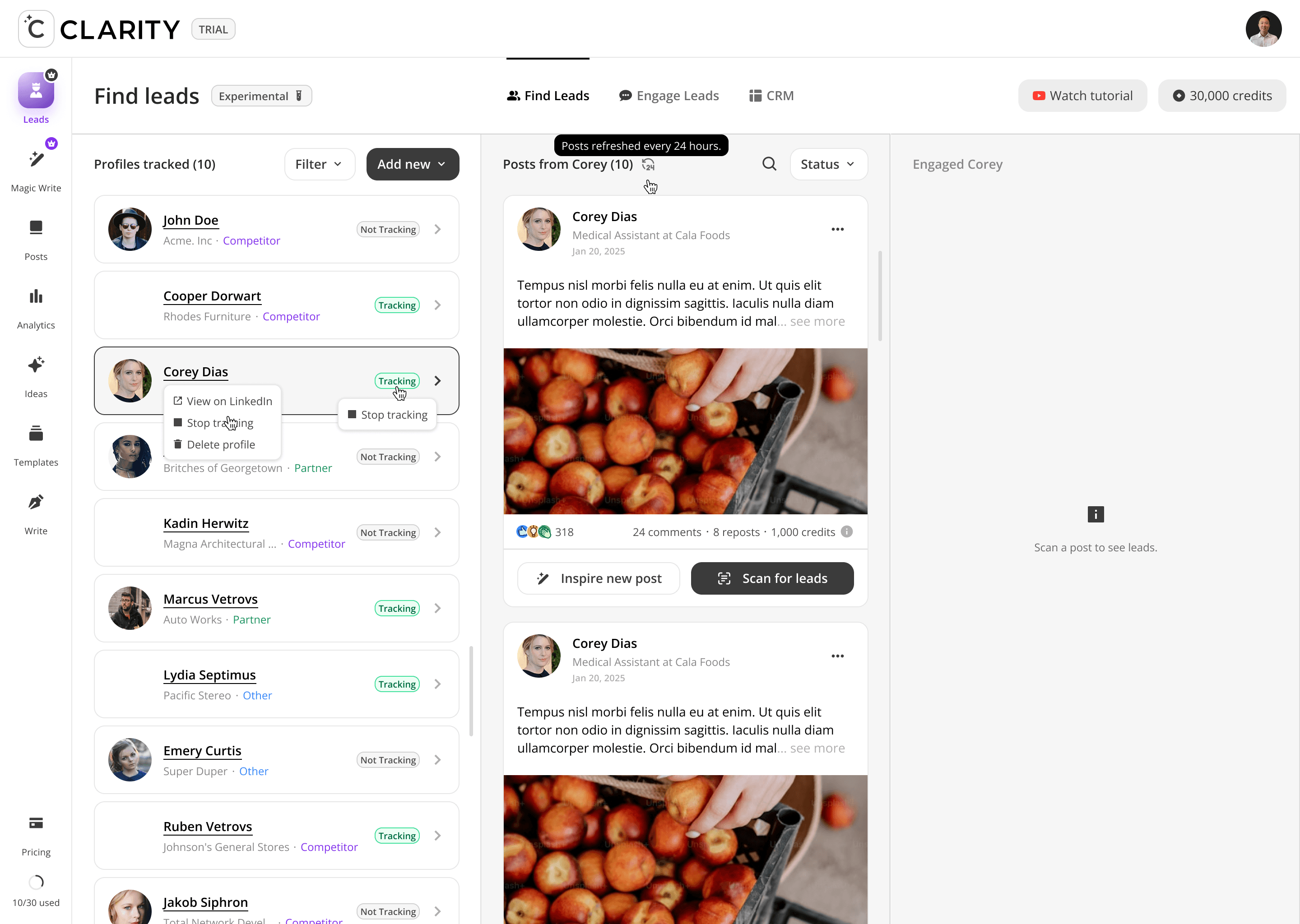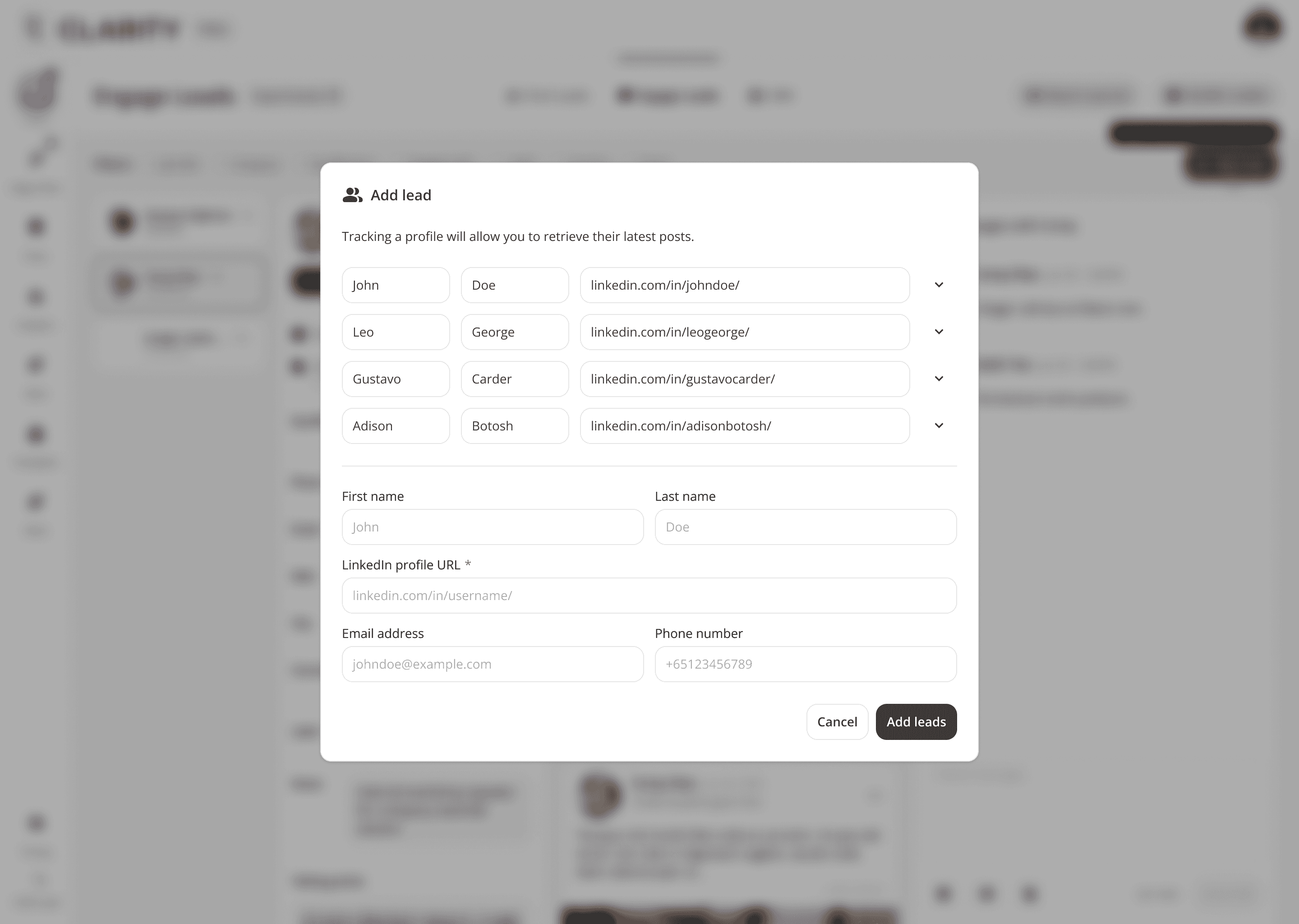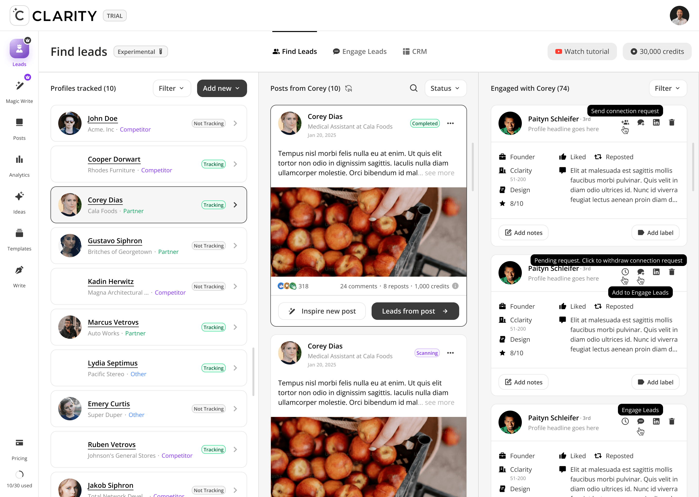 The top-of-funnel engine. Users track LinkedIn profiles including competitors, partners, industry voices, and Cclarity automatically scans their posts, extracts everyone who engaged, and surfaces those people as warm, pre-qualified lead candidates. The core idea: the audience already raising their hand around your space is your highest-intent pool of prospects.