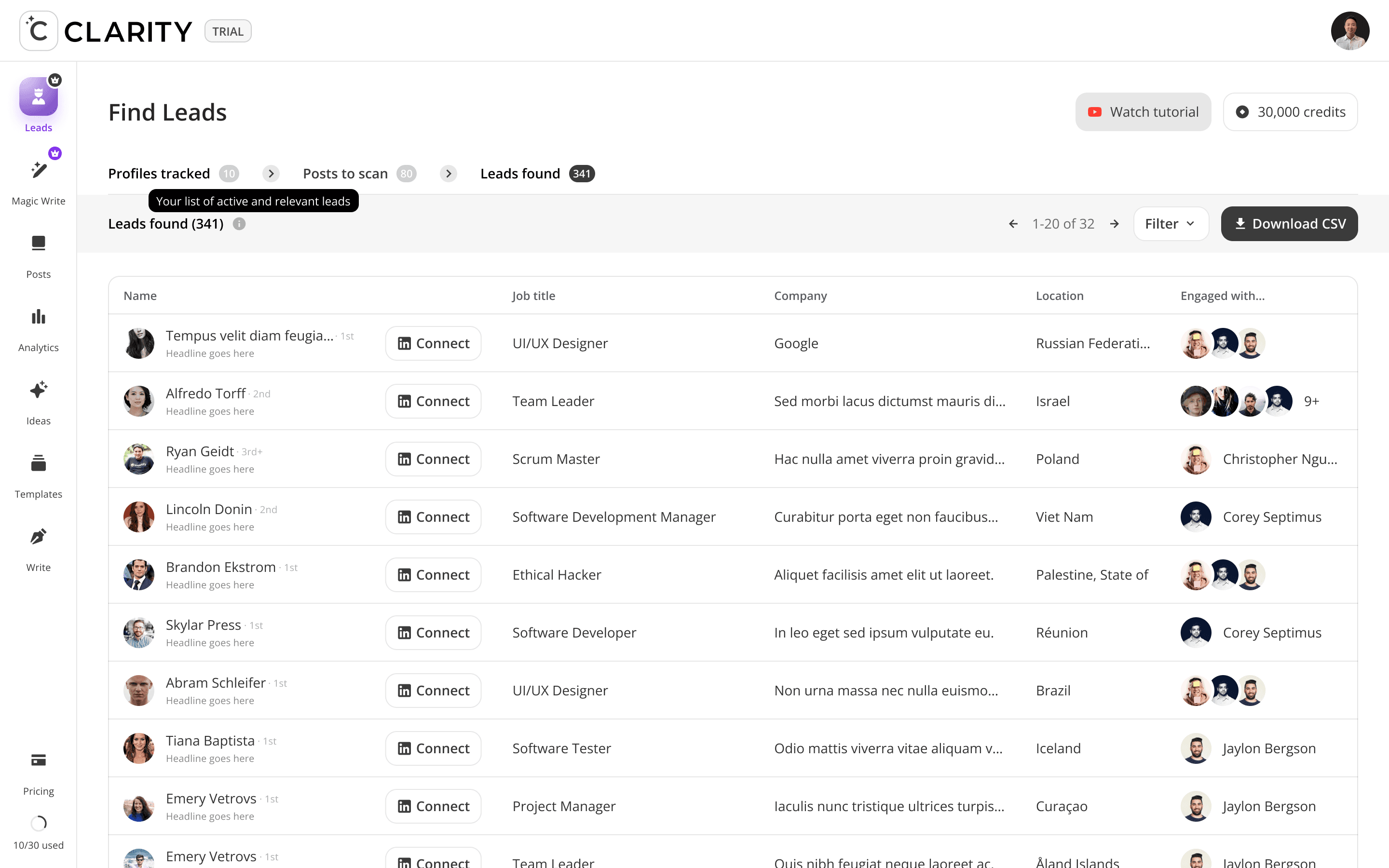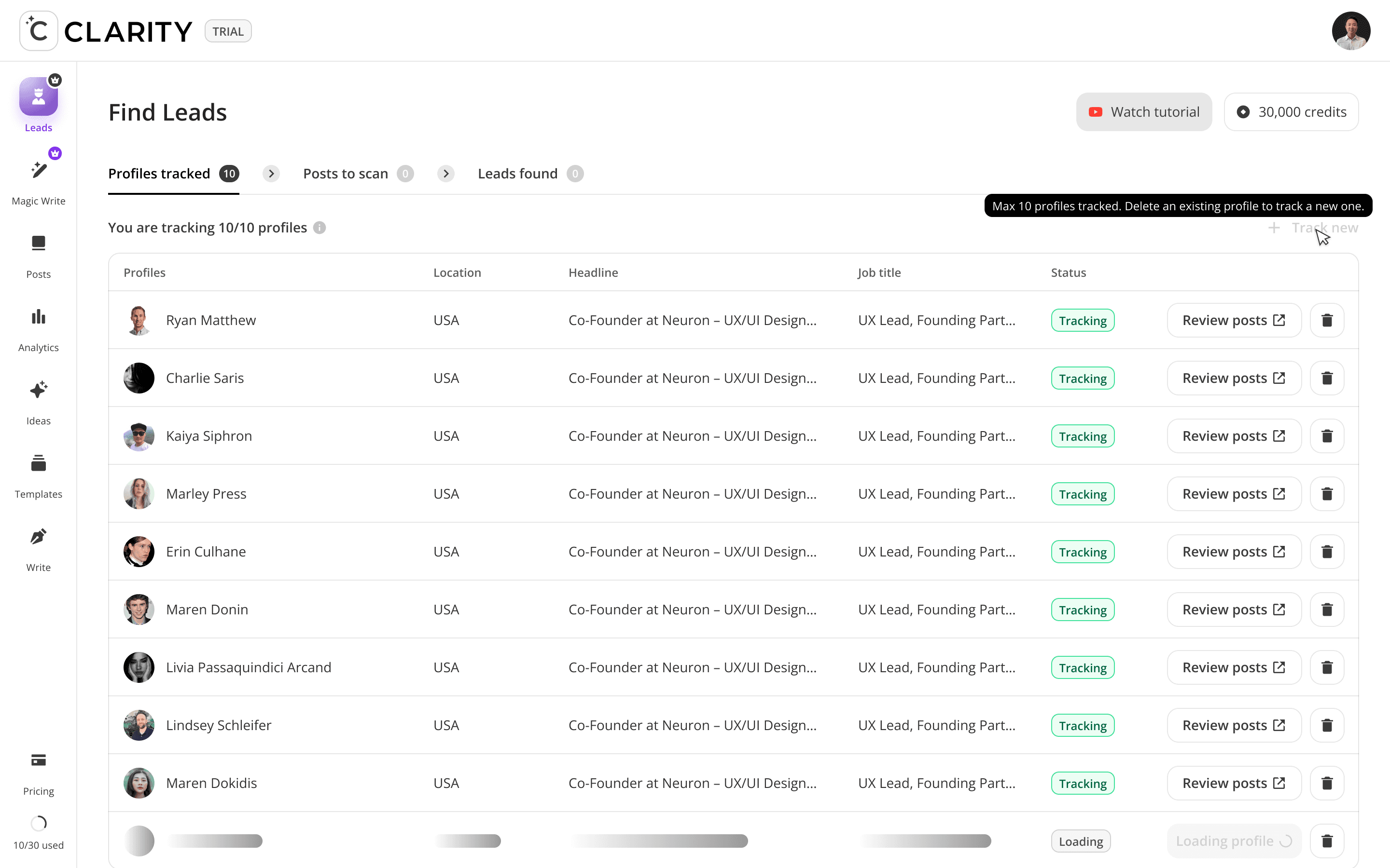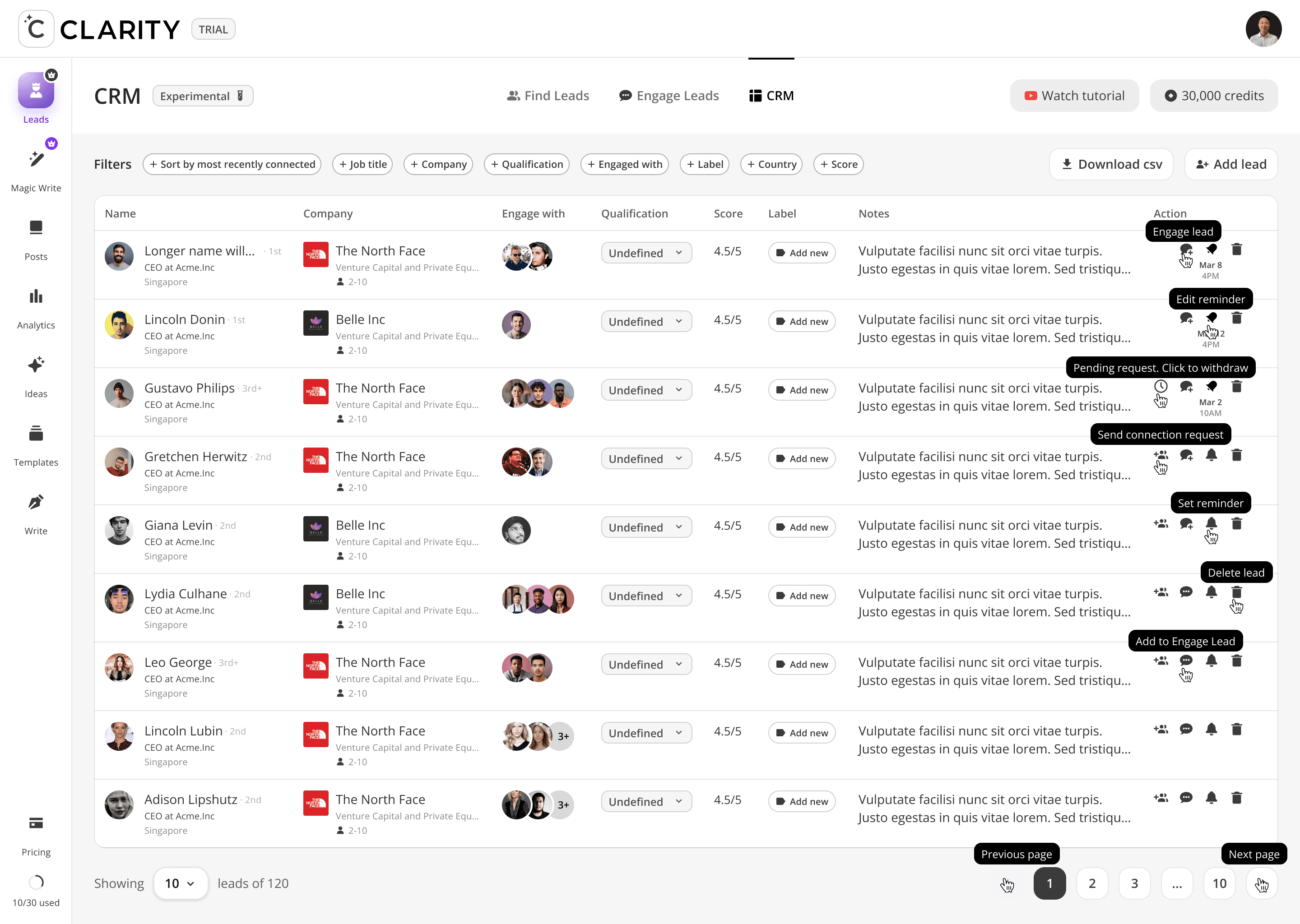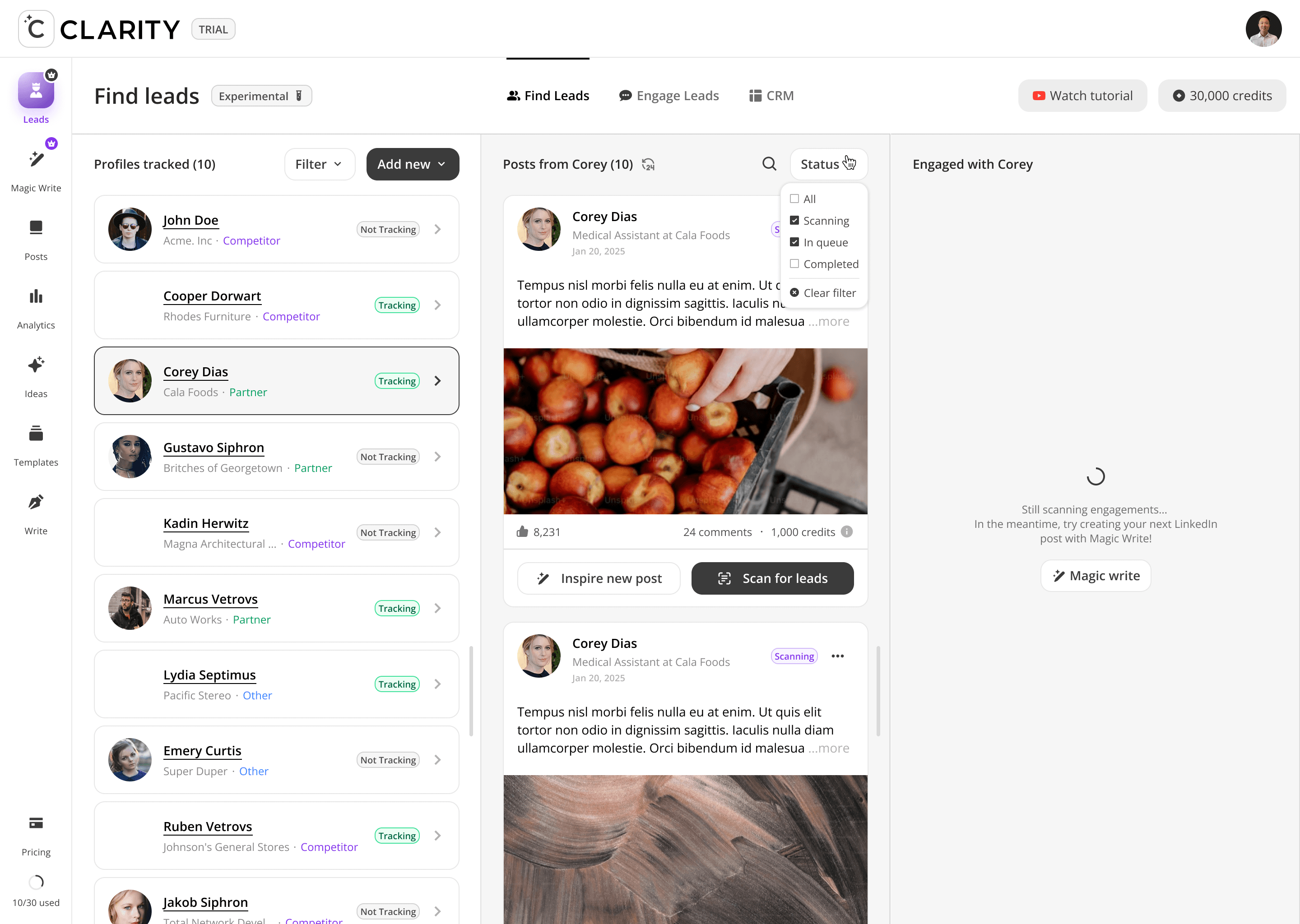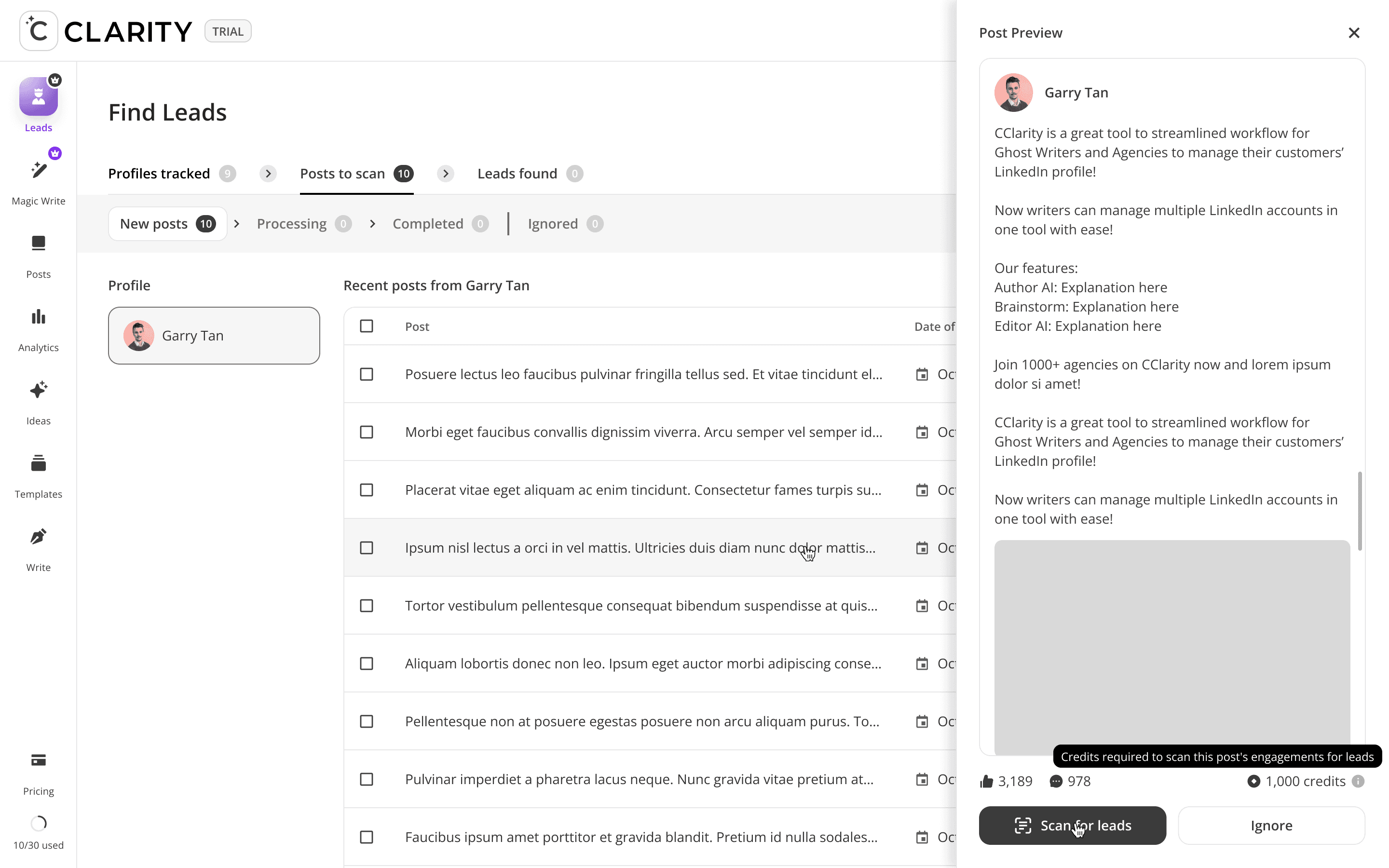 The top-of-funnel engine. Users track LinkedIn profiles including competitors, partners, industry voices, and Cclarity automatically scans their posts, extracts everyone who engaged, and surfaces those people as warm, pre-qualified lead candidates. The core idea: the audience already raising their hand around your space is your highest-intent pool of prospects.