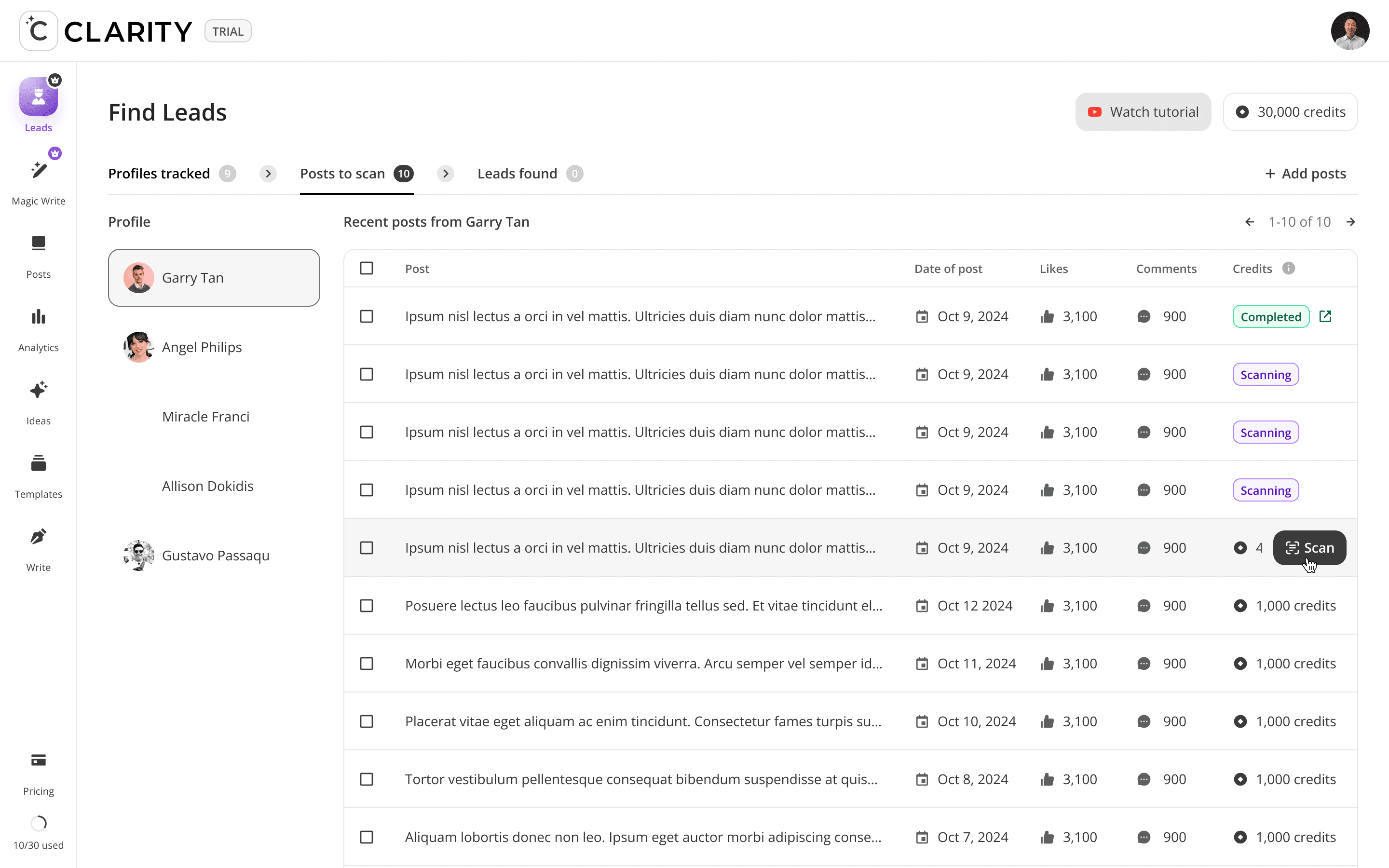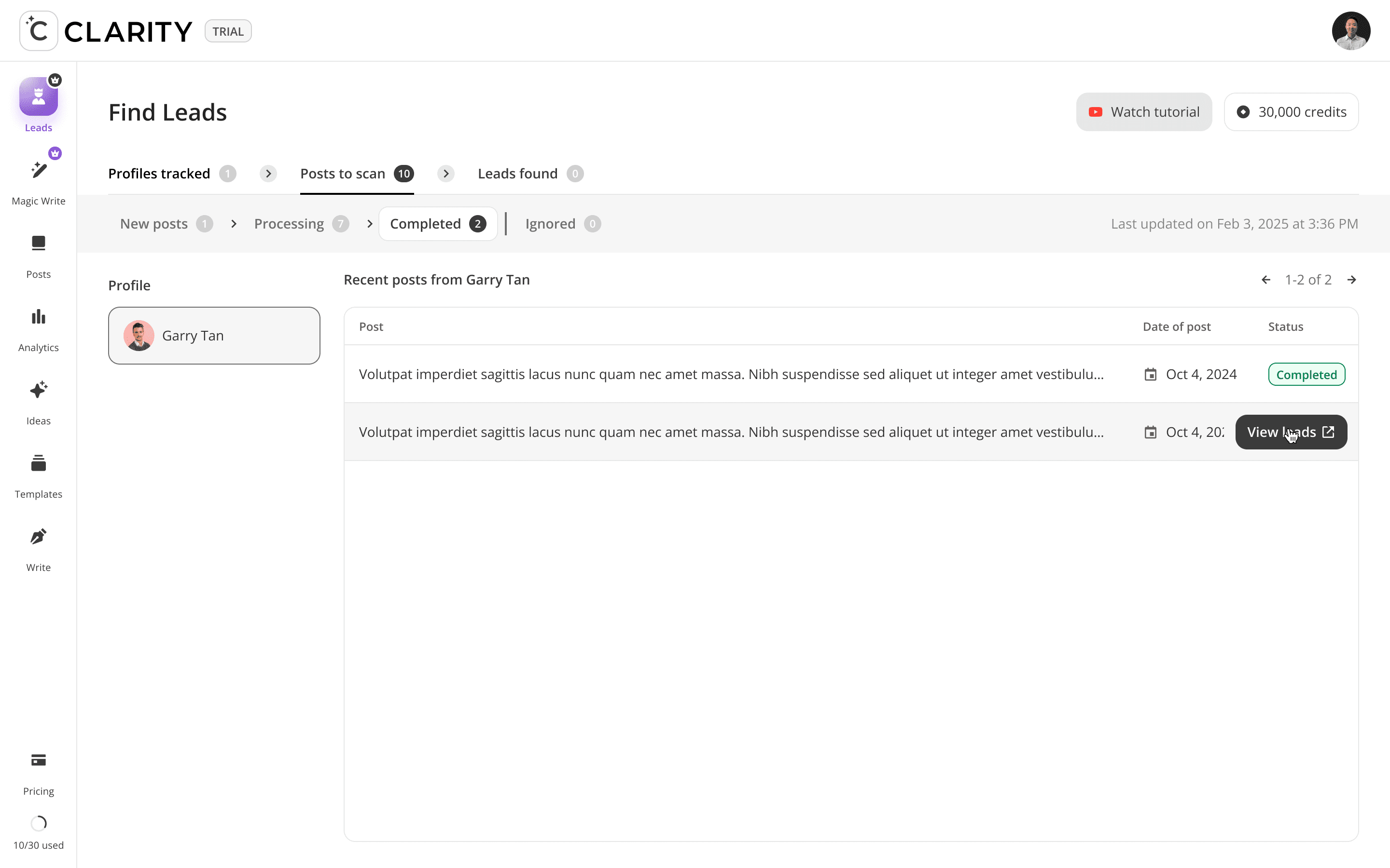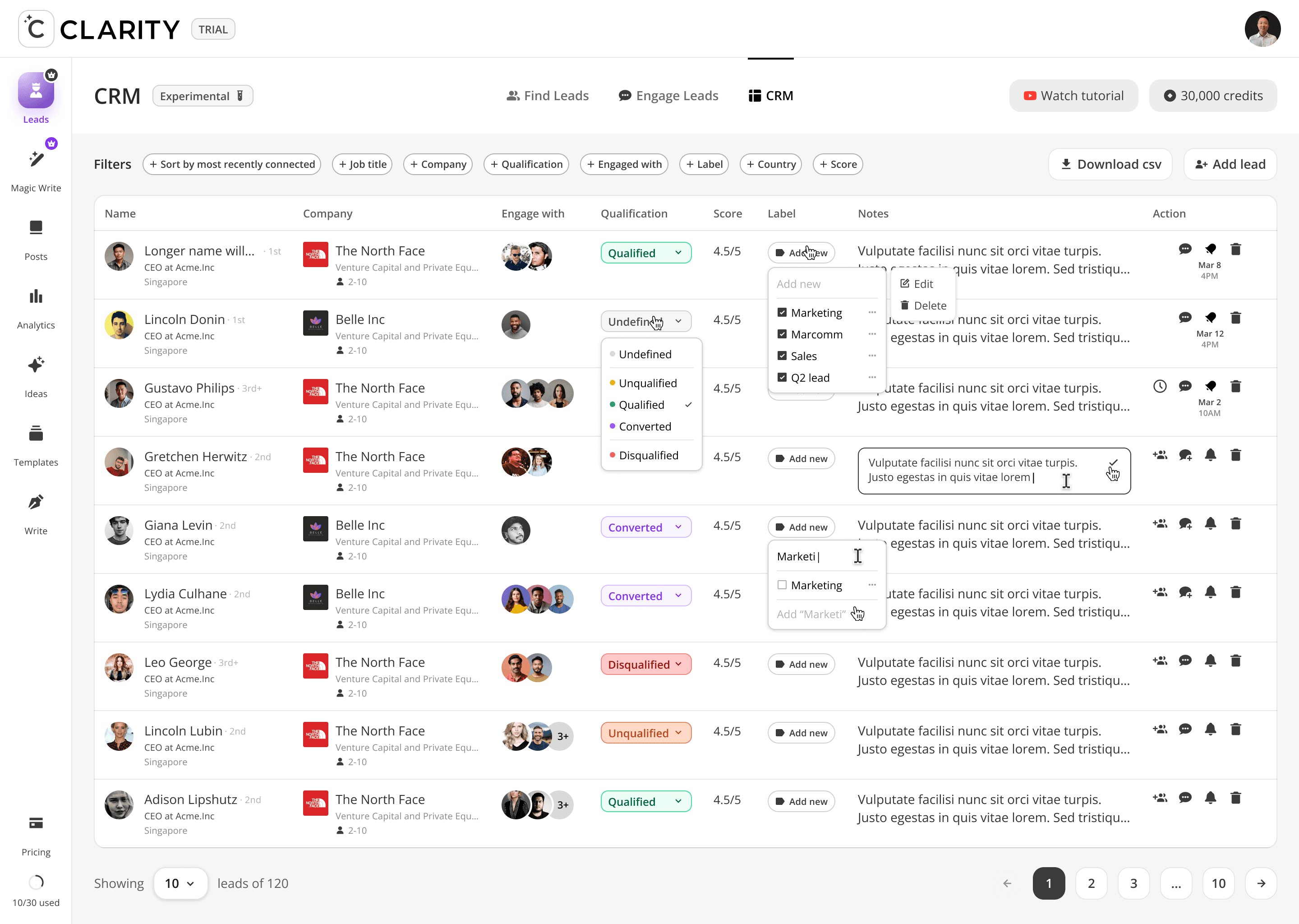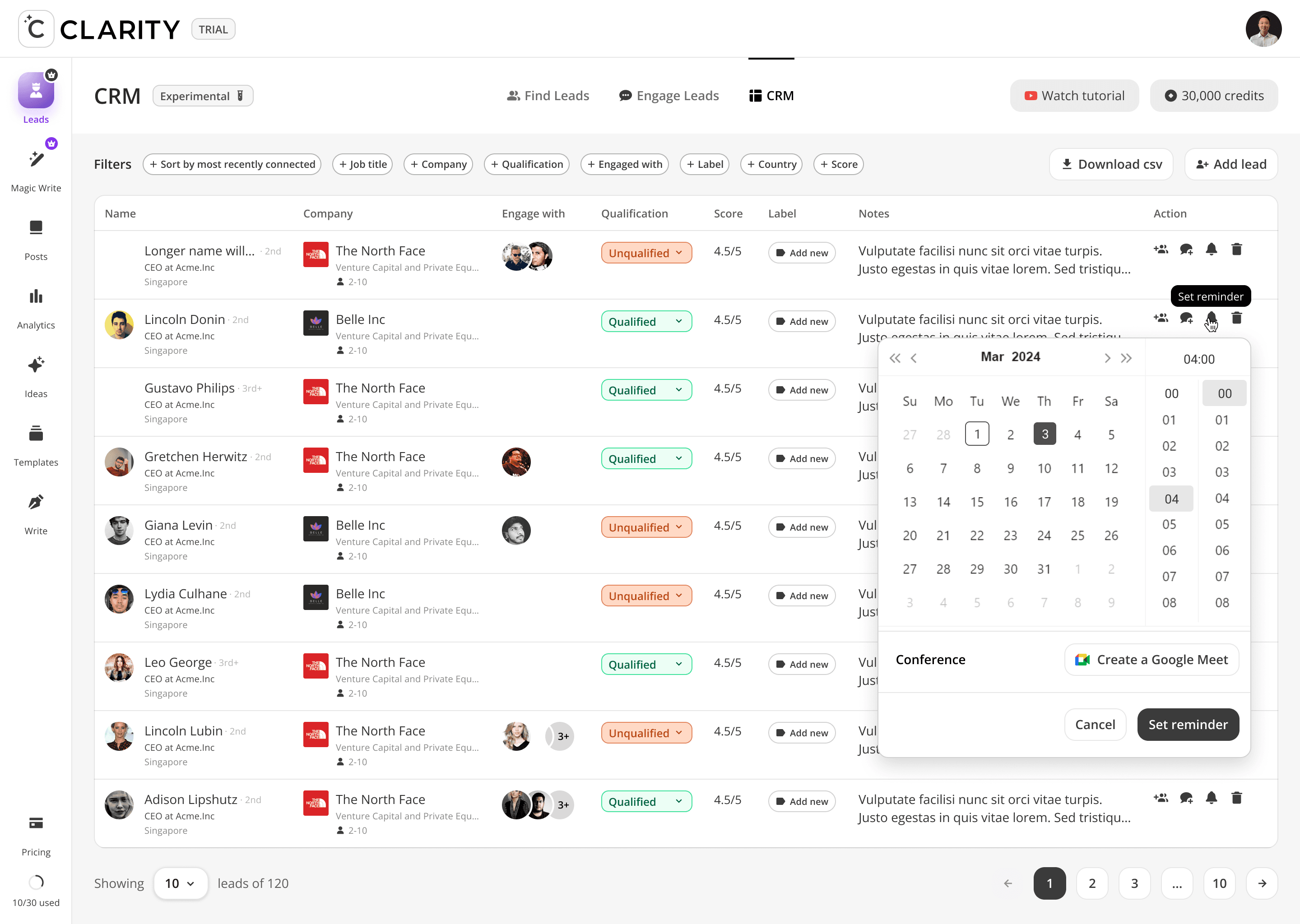 The top-of-funnel engine. Users track LinkedIn profiles including competitors, partners, industry voices, and Cclarity automatically scans their posts, extracts everyone who engaged, and surfaces those people as warm, pre-qualified lead candidates. The core idea: the audience already raising their hand around your space is your highest-intent pool of prospects.