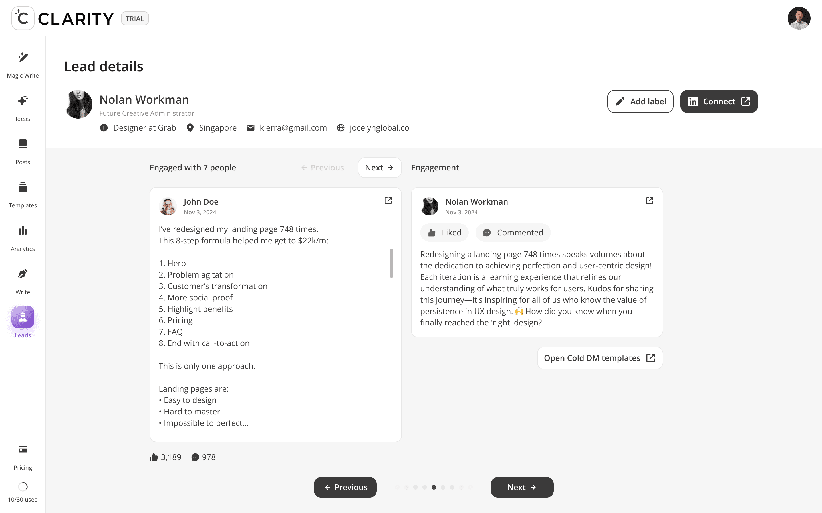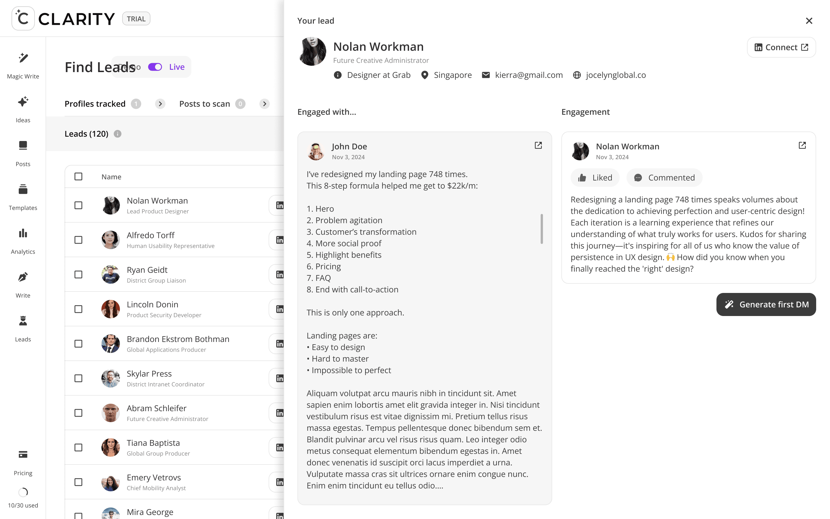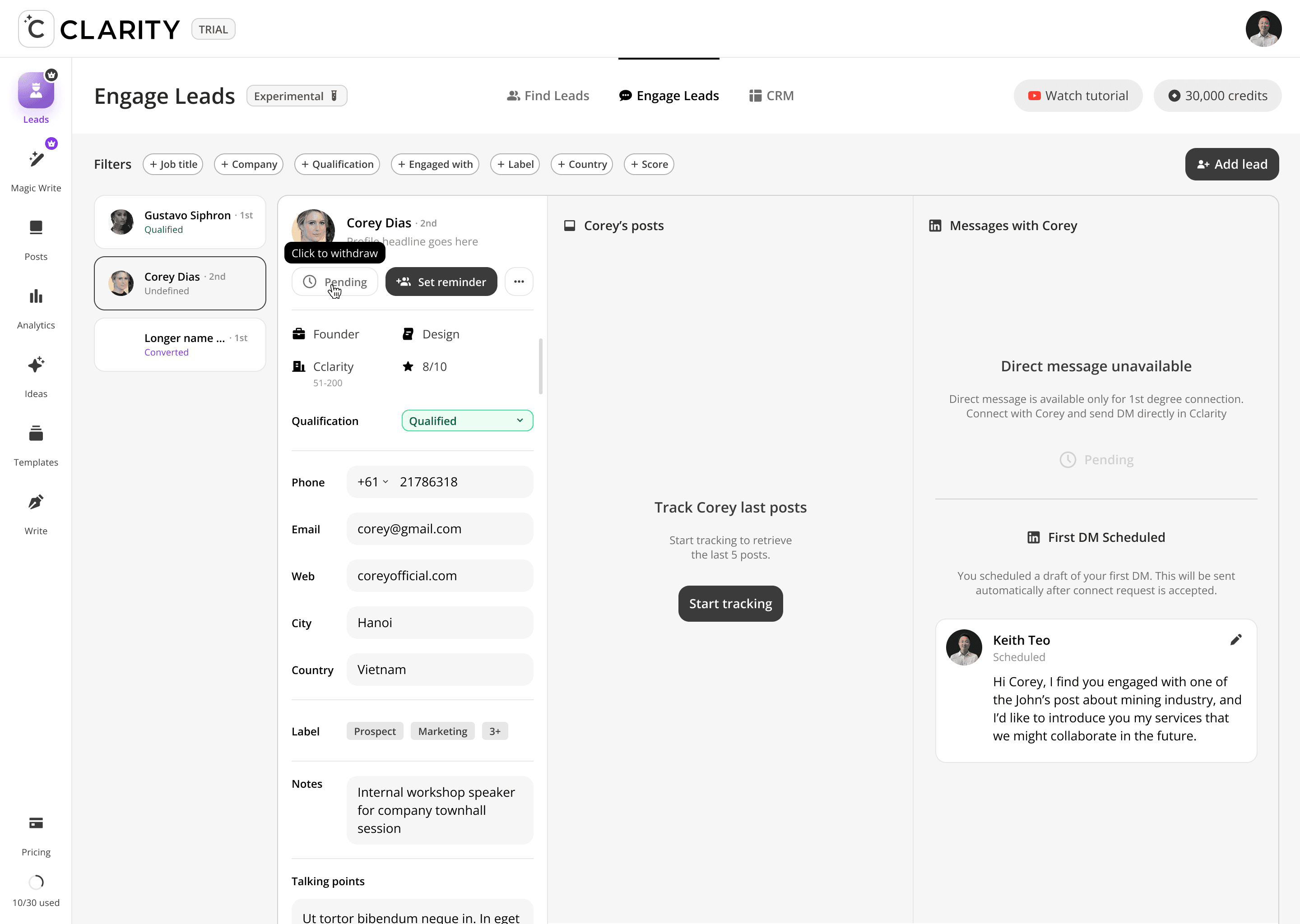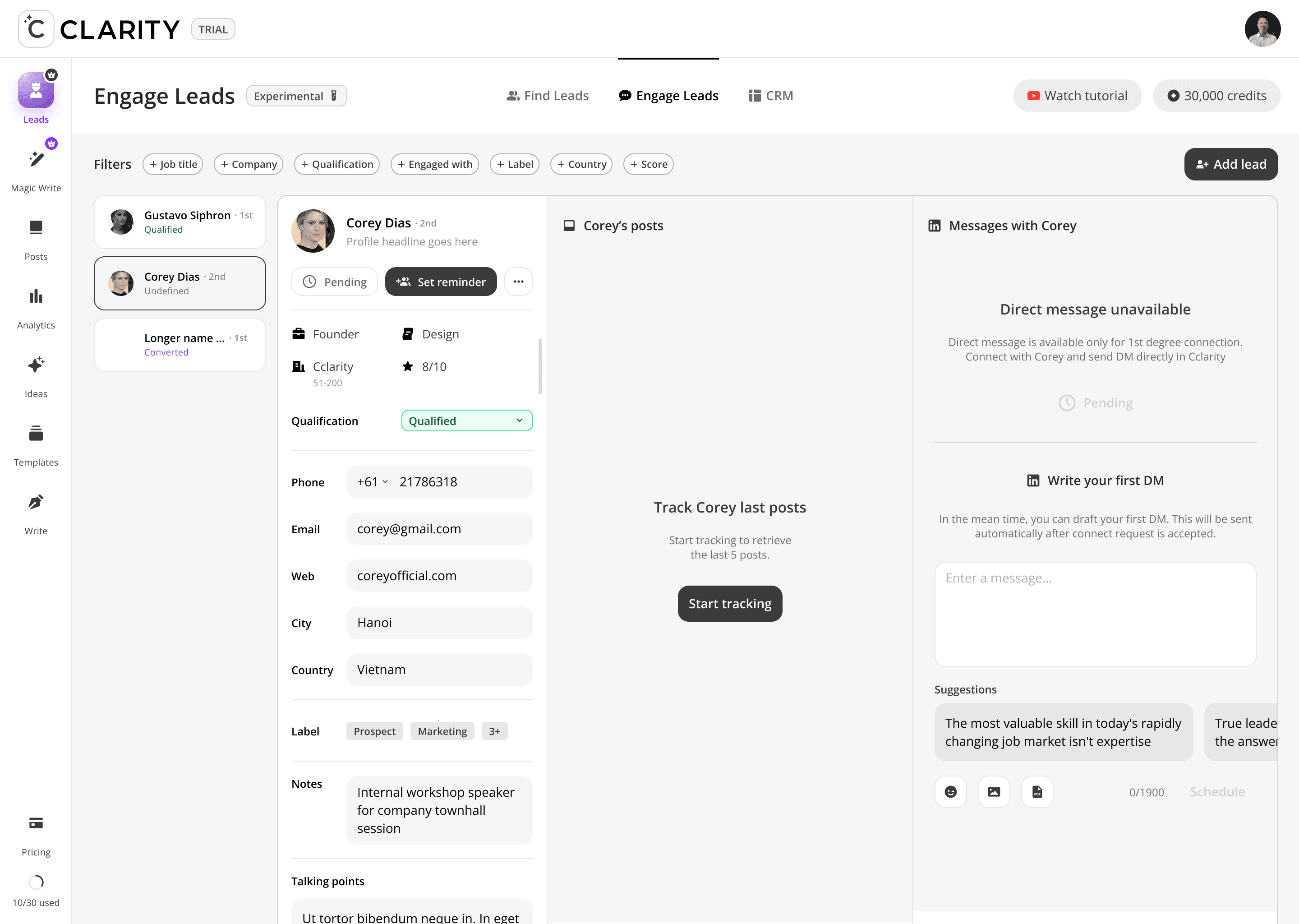 Where the pipeline becomes active. Once a lead is added from Find Leads, Engage Leads becomes the workspace for the entire relationship-building motion, like reviewing their profile, consuming and interacting with their content, and crafting a personalized DM — all within a single, unified view. The design philosophy here is deliberate warmth before direct outreach: engage with their posts first, then send the message.