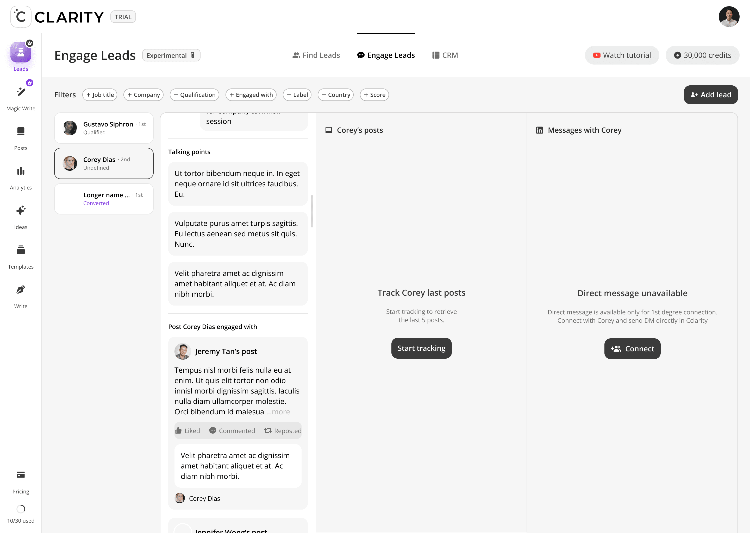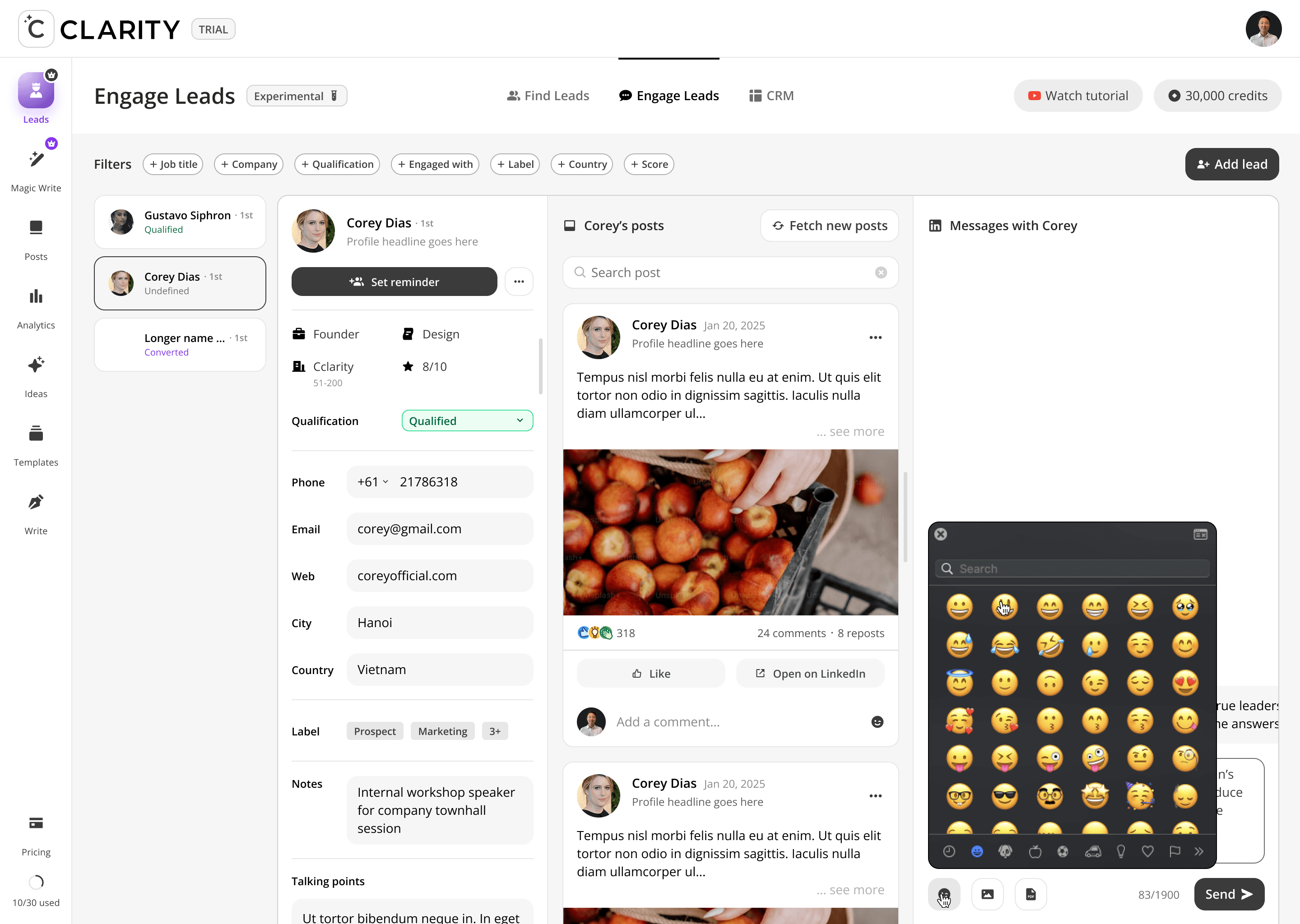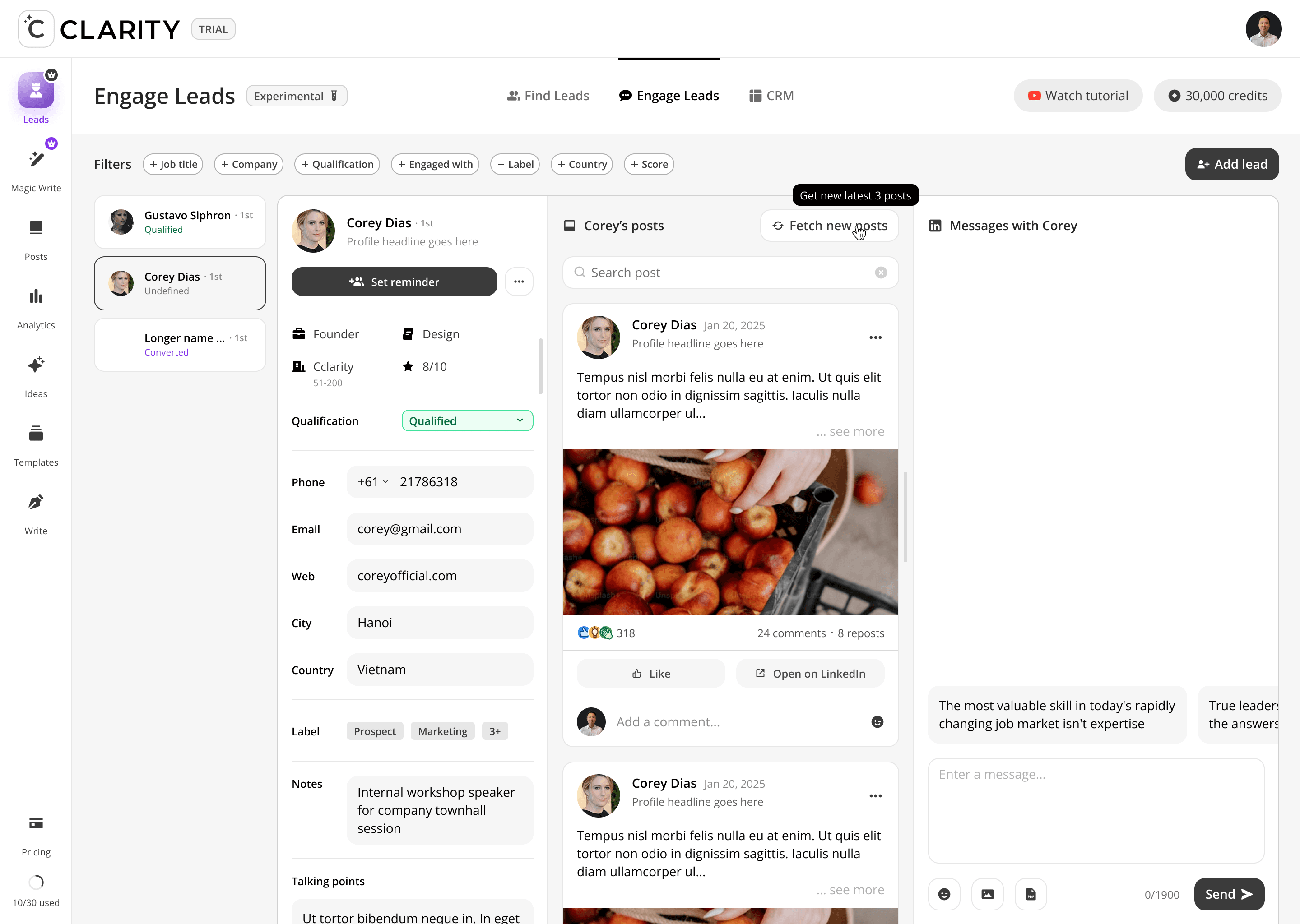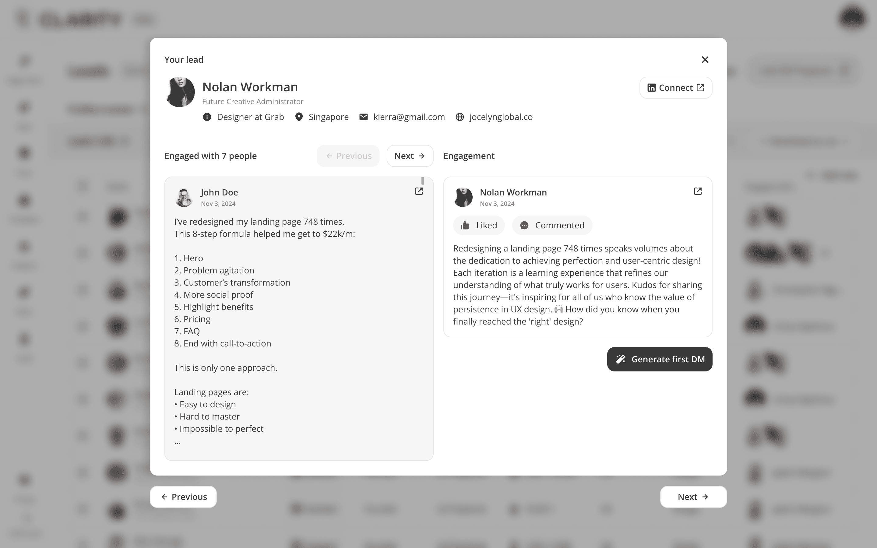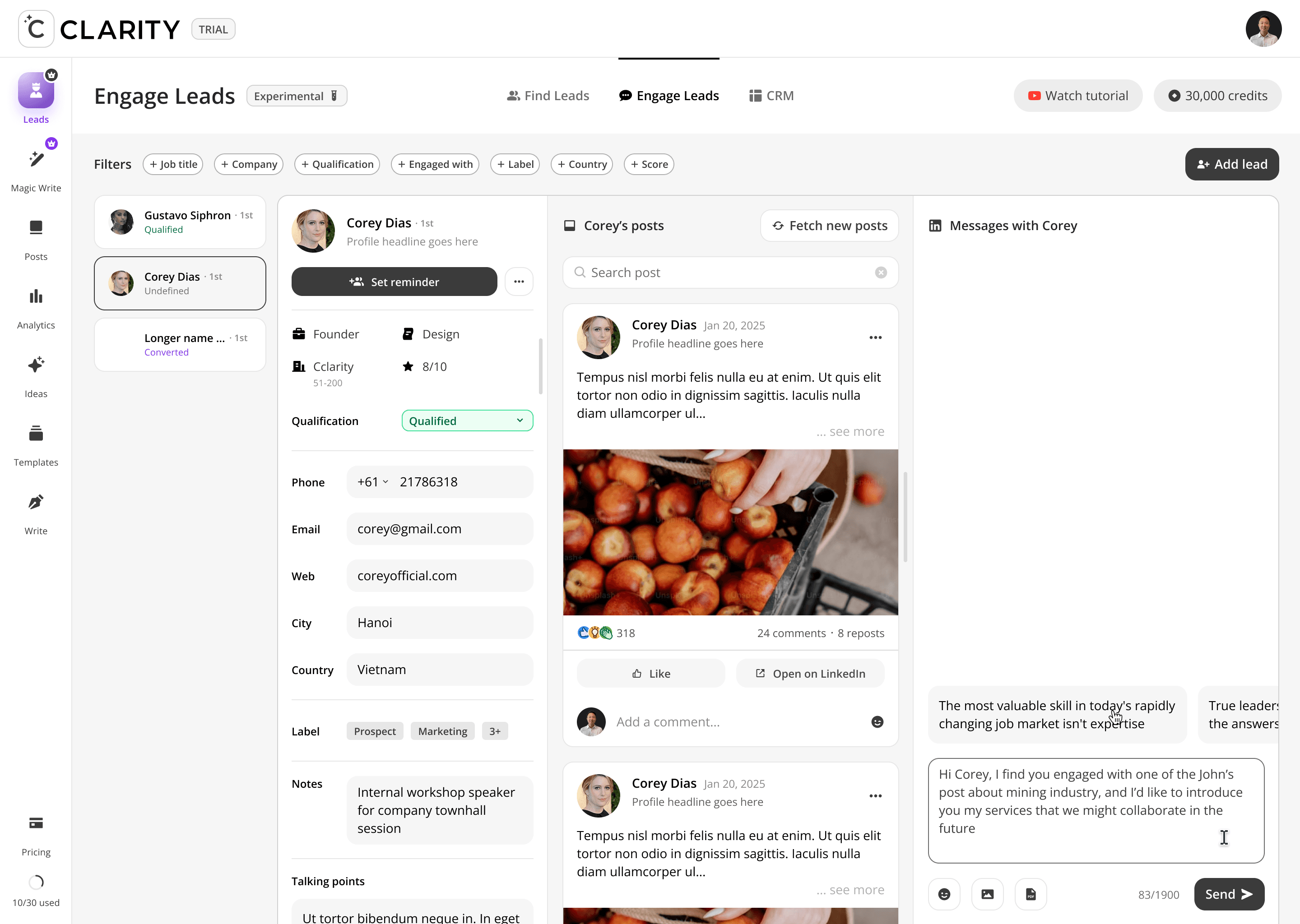 Where the pipeline becomes active. Once a lead is added from Find Leads, Engage Leads becomes the workspace for the entire relationship-building motion, like reviewing their profile, consuming and interacting with their content, and crafting a personalized DM — all within a single, unified view. The design philosophy here is deliberate warmth before direct outreach: engage with their posts first, then send the message.