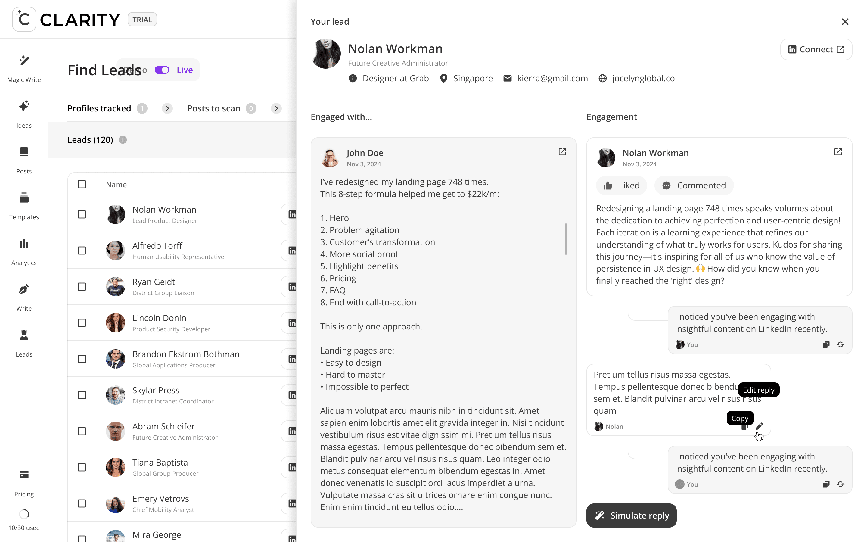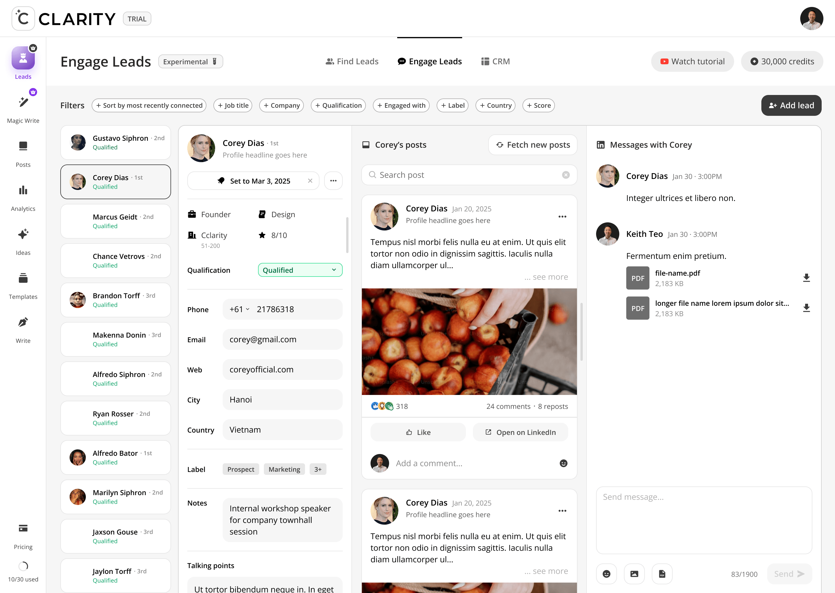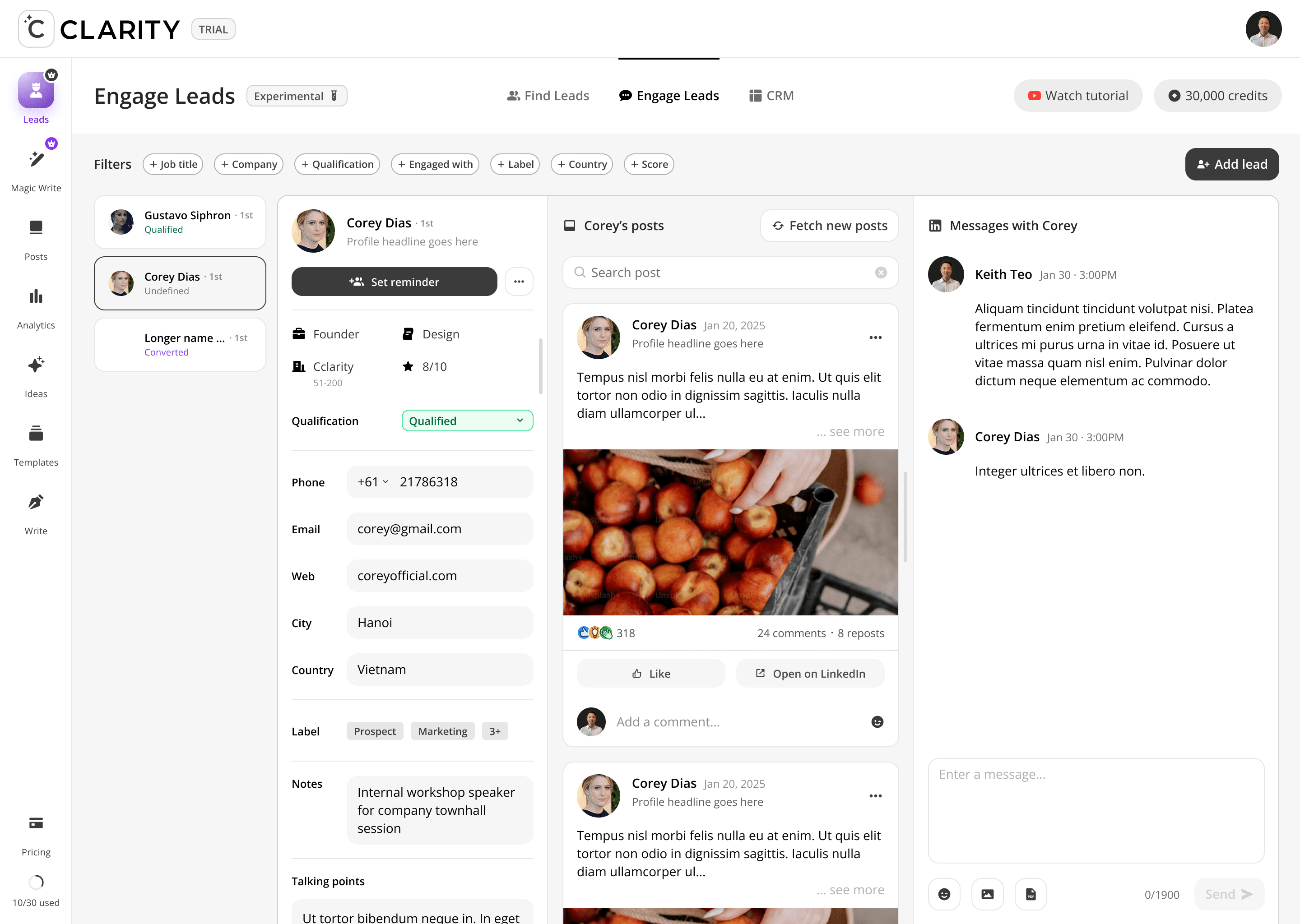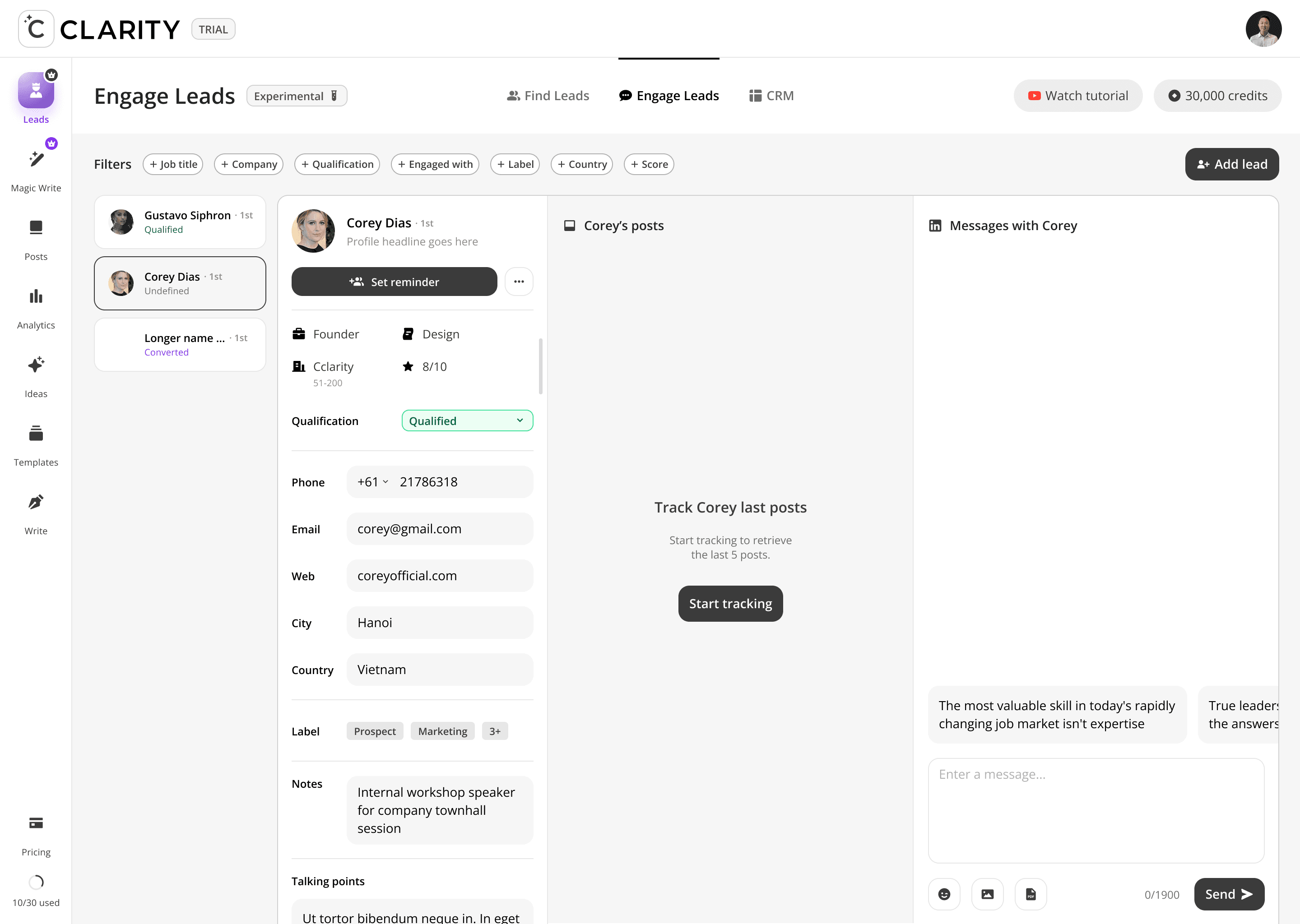 Where the pipeline becomes active. Once a lead is added from Find Leads, Engage Leads becomes the workspace for the entire relationship-building motion, like reviewing their profile, consuming and interacting with their content, and crafting a personalized DM — all within a single, unified view. The design philosophy here is deliberate warmth before direct outreach: engage with their posts first, then send the message.