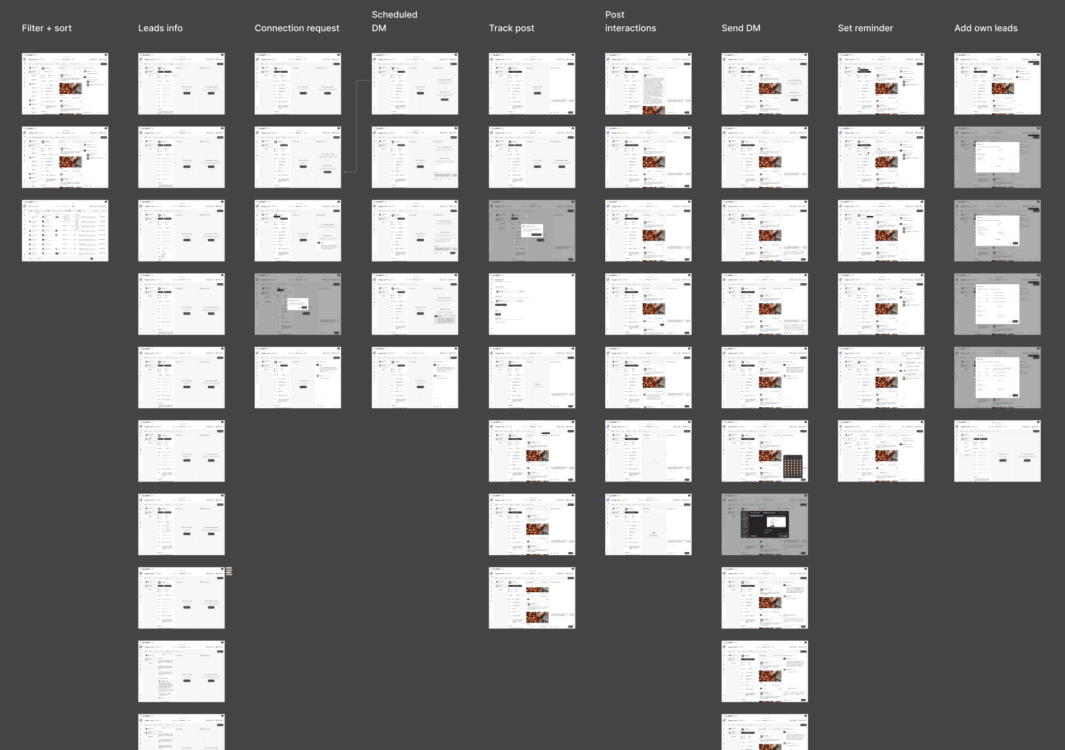 I interviewed 12 founders who had tried LinkedIn outreach and failed, plus 6 who were actively running manual pipelines. I shadowed the Cclarity ops team for two weeks to document every handoff, bottleneck, and workaround they used. The biggest reveal: 40% of team time was spent on tasks that should have been surfaced automatically by a product.