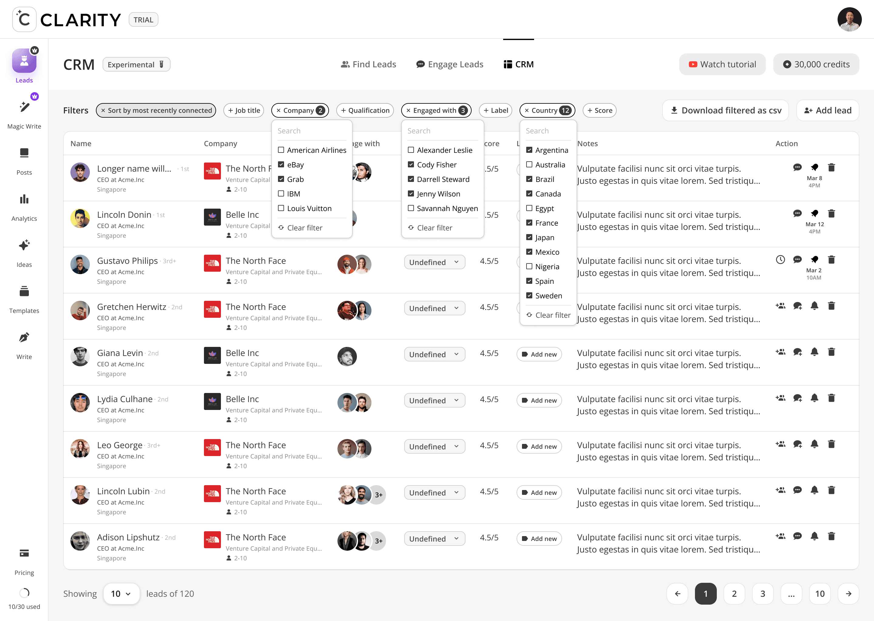 The filter bar (Job title, Company, Qualification, Engaged with, Label, Country, Score) is designed for users with a large lead pool — letting them narrow focus to a specific campaign or outreach batch without needing to exit into a separate CRM view. "Engaged with" is particularly powerful: filter to all leads who engaged with a specific post, then batch-draft contextual DMs referencing that post.