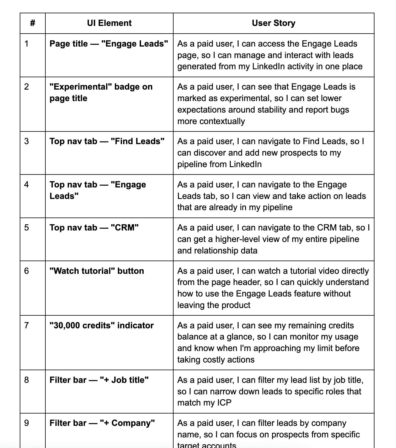 I mapped the gap between what the current product provided (content confidence) and what clients needed downstream (pipeline confidence). Core Job to be done (JTBD): "When a lead engages with my post, I want to know who they are and what's being done, so I can feel confident something is happening on my behalf." This shaped every subsequent design decision.